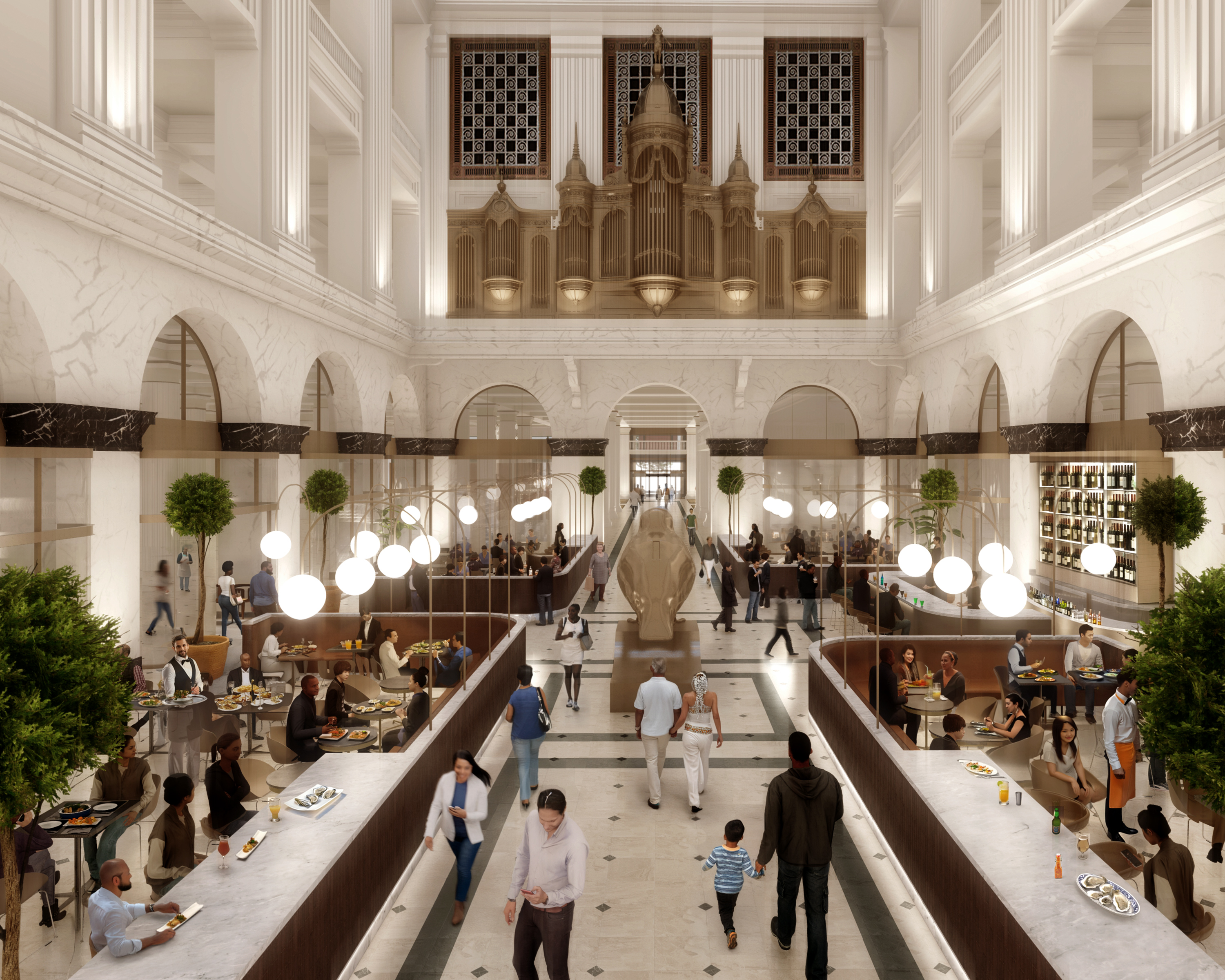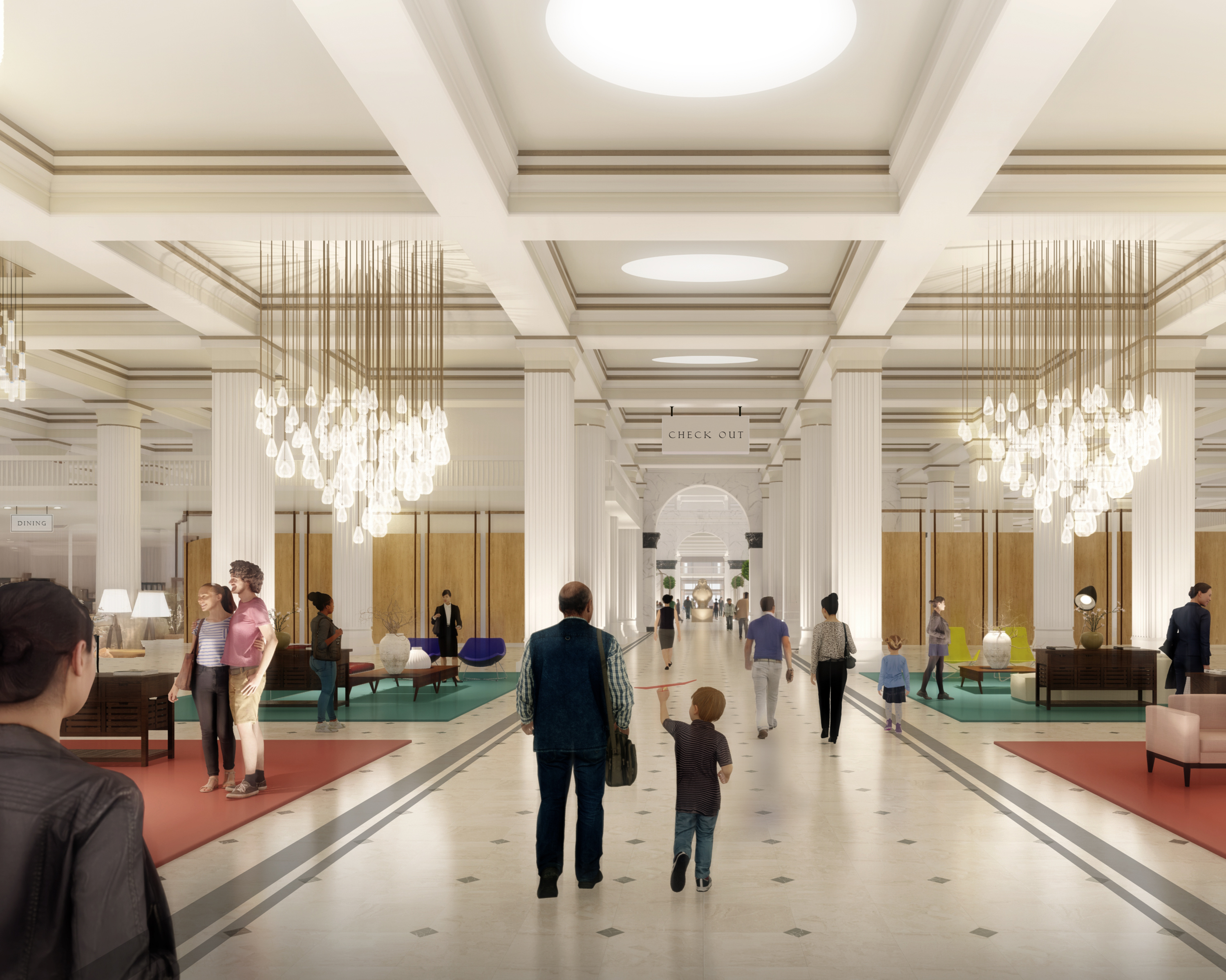 The Wanamaker Building was built on the original site of the Grand Depot at Thirteenth and Market Streets to house the flagship Wanamaker Department Store and its corporate offices. Since then the property has transitioned from a landmark department store headquarters to a major Class AA office and retail property, and now is being repositioned as one of the largest adaptive re-use projects in the country. With twelve (12) stories above ground and three (3) stories below, The Wanamaker Building is being reimaged into three levels of retail, two levels of office, and 620+ luxury loft apartments with ~600 parking spaces. In addition to the embedded amenities of a live-work-play environment, the new residences at The Wanamaker Building will feature 15+ foot ceiling heights, best in class amenities, and a world class roof deck offering sweeping views of the skyline. One of the largest buildings in Philadelphia, the property occupies an entire city block bounded by Market Street, Chestnut Street, Thirteenth Street and Juniper Street.